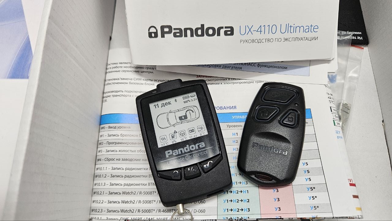 - Установка и настройка премиальной охранно-телематической системы Pandora UX 4110 Ultimate, включающей флагманский брелок Pandora Ultimate с увеличенной дальностью действия, информативным дисплеем и надёжной двусторонней связью. Система оснащена LTE-модемом (4G/3G/2G), GPS/GLONASS-приёмником, поддерживает Bluetooth 5.0, работу по CAN FD, а также интеграцию с гибридными и электрическими автомобилями.