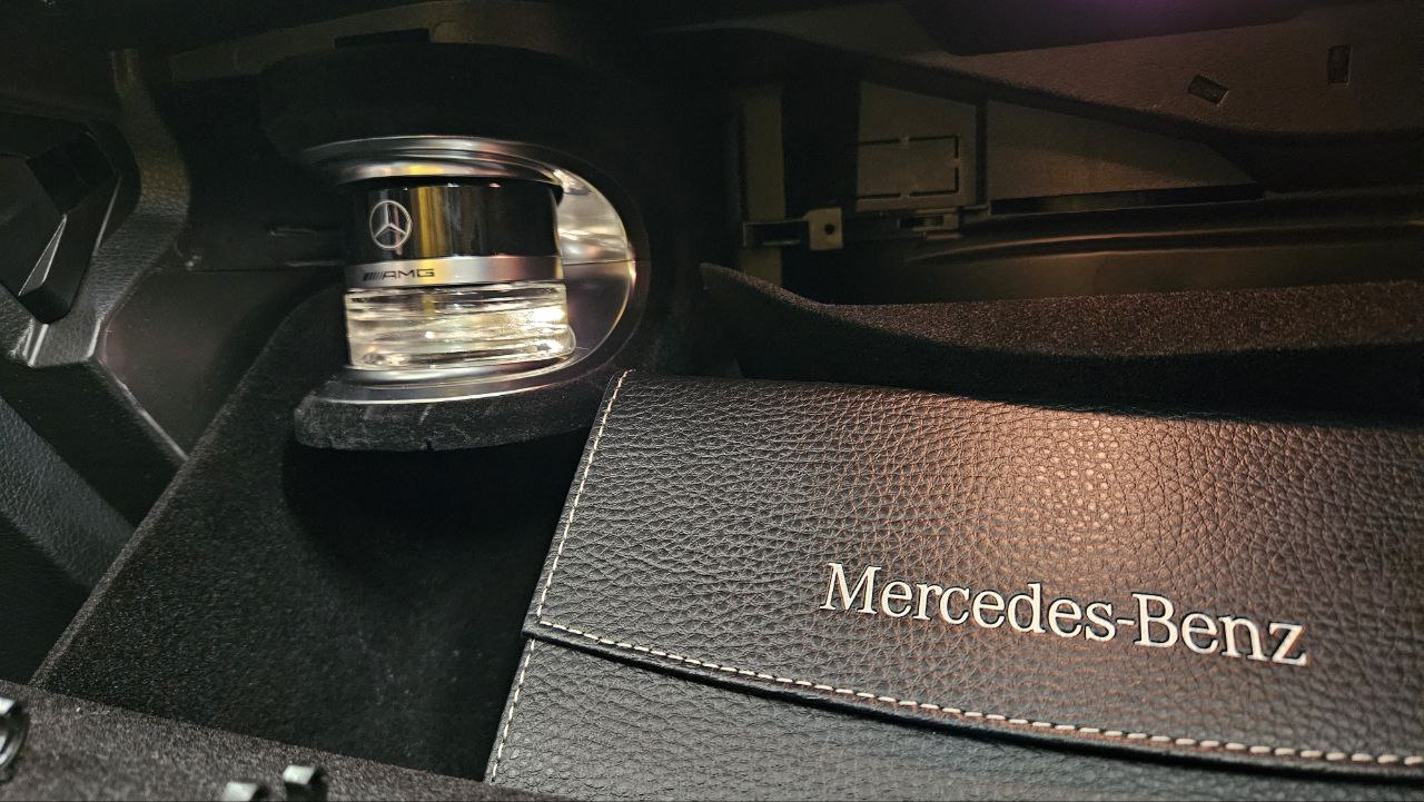 В рамках проекта модифицировали перчаточный отсек под установку штатного модуля ароматизатора с фирменным флаконом Mercedes-Benz, а также интегрировали ионизатор в пространство за приборной панелью. После физического монтажа провели программную настройку через штатное меню мультимедийной системы — теперь владелец может в любой момент включить или отключить ионизацию, а также плавно регулировать интенсивность ароматизации в салоне.
